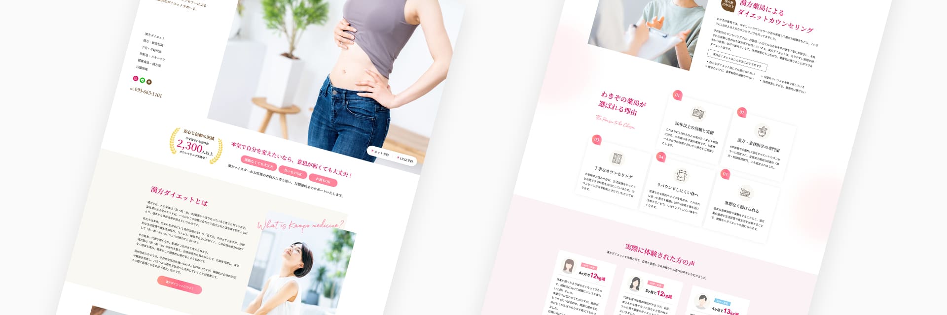 現在の顧客層よりも少し年齢を下げたターゲット層向けのデザインと、実際に体験されたお客様の声を掲載することで敷居が高いと思われがちな漢方相談薬局に対して安心感を持ってもらえるようなページ構成にしました。